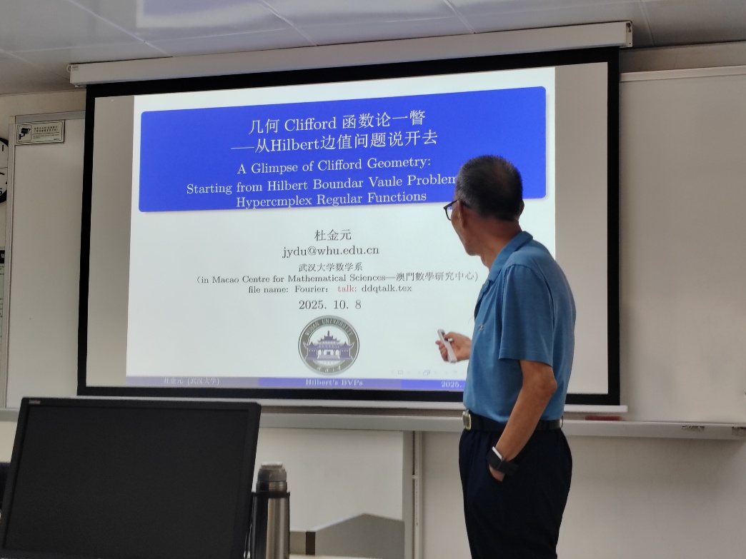 武汉大学数学与统计学院杜金元教授于2025年10月16日下午访问澳门科技大学,获澳门科技大学澳门数学研究中心主任钱涛教授以及助理主任肖玄玄副教授的热情接待。 杜金元教授专注于复分析与超复边值问题研究,涉及分数阶微积分的理论体系及应用计算方法。其主要研究方向为奇异积分方程的数值方法及其在弹性力学和断裂力学中的应用。他在柯西型奇异积分的机械求积法方面贡献卓著,传承并拓展了亨特、佩吉特、埃利奥特等学者及厄尔多安力学学派在奇异积分数值求积领域的开创性工作。其在奇异积分机械求积法与奇异积分方程数值解方面的研究成果,有力推动了该学科理论与应用实践的发展。此外,杜教授还承担研究生培养工作,并通过中国数学会等学术组织积极参与学科服务,助力数学物理与工程应用领域的创新发展。