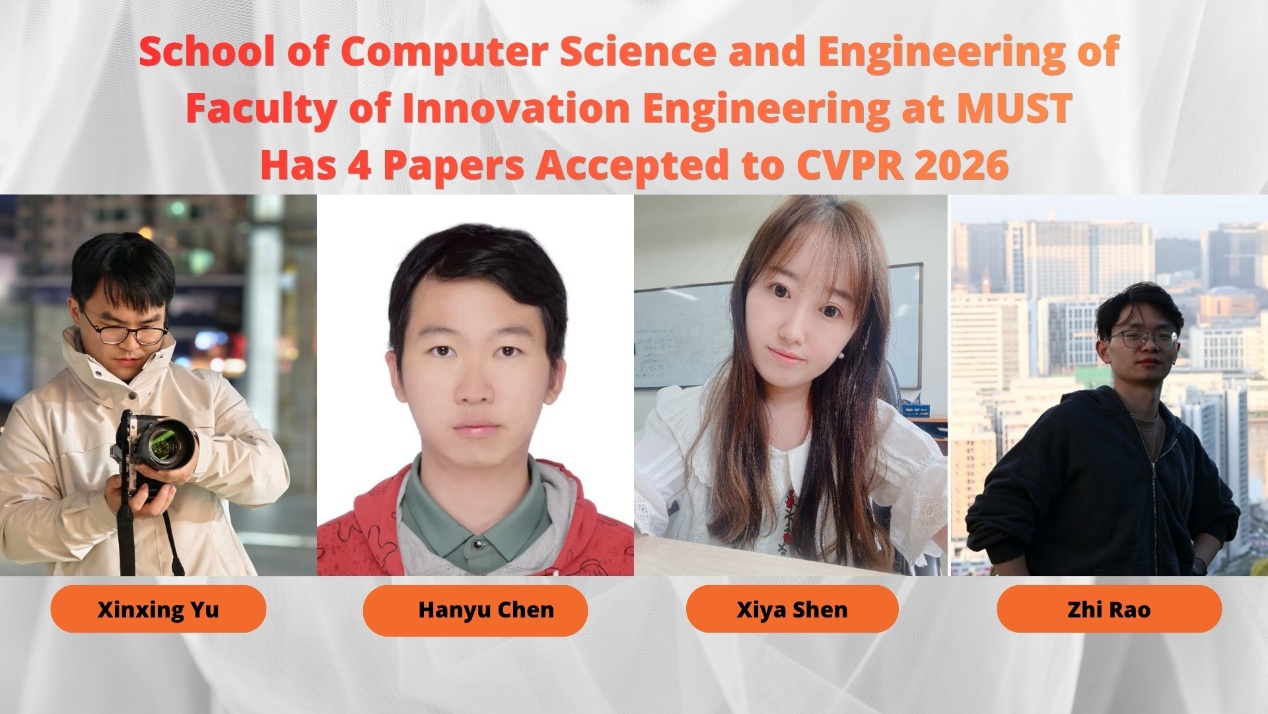 The acceptance results for CVPR 2026 (IEEE/CVF Conference on Computer Vision and Pattern Recognition), a premier international conference in computer vision and pattern recognition, have recently been announced. A total of four papers from the School of Computer Science and Engineering of Faculty of Innovation Engineering at Macau University of Science and Technology (MUST) were accepted, including three papers to the main conference and one paper to CVPR Findings. CVPR 2026 received 16,092 valid submissions, of which 4,090 were accepted to the main conference, corresponding to an acceptance rate of only 25.42%. In addition, 1,717 papers were selected for CVPR Findings.